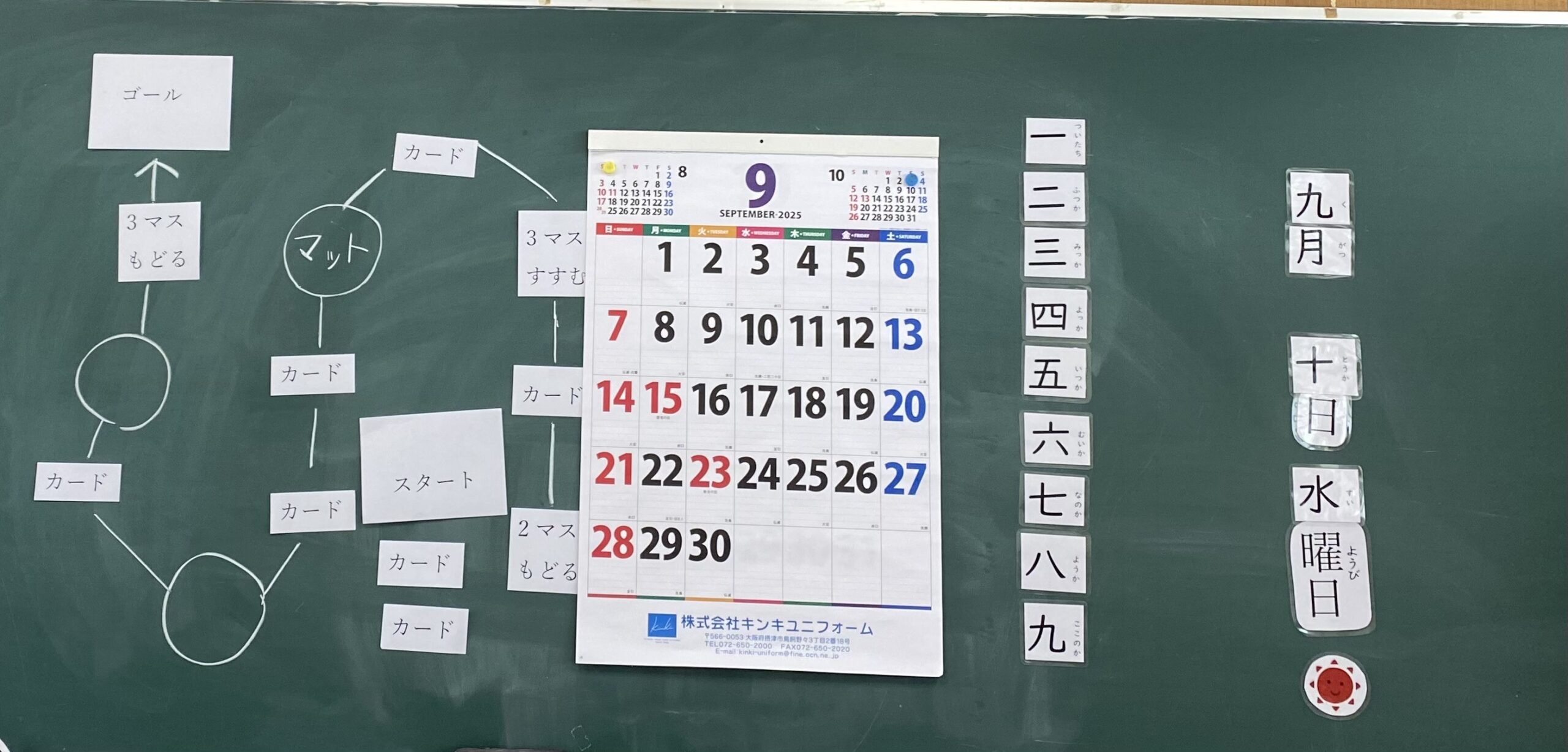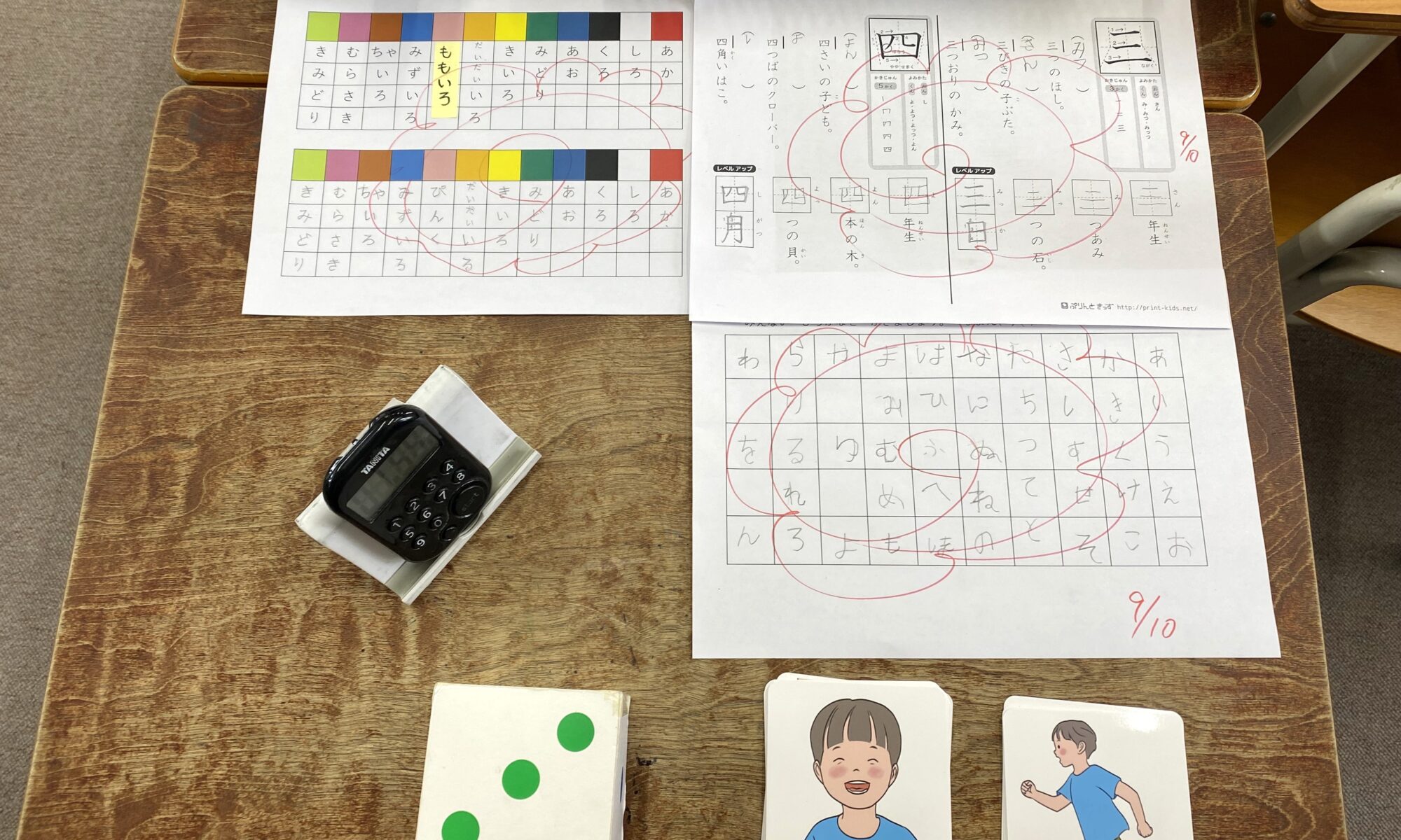 色の名前の復習は、実際にその色を見つけながら、プリントに書きました。そして先生お手製のすごろくに大盛り上がり🎲「一つもどる」の連発で、みんなで大笑い!